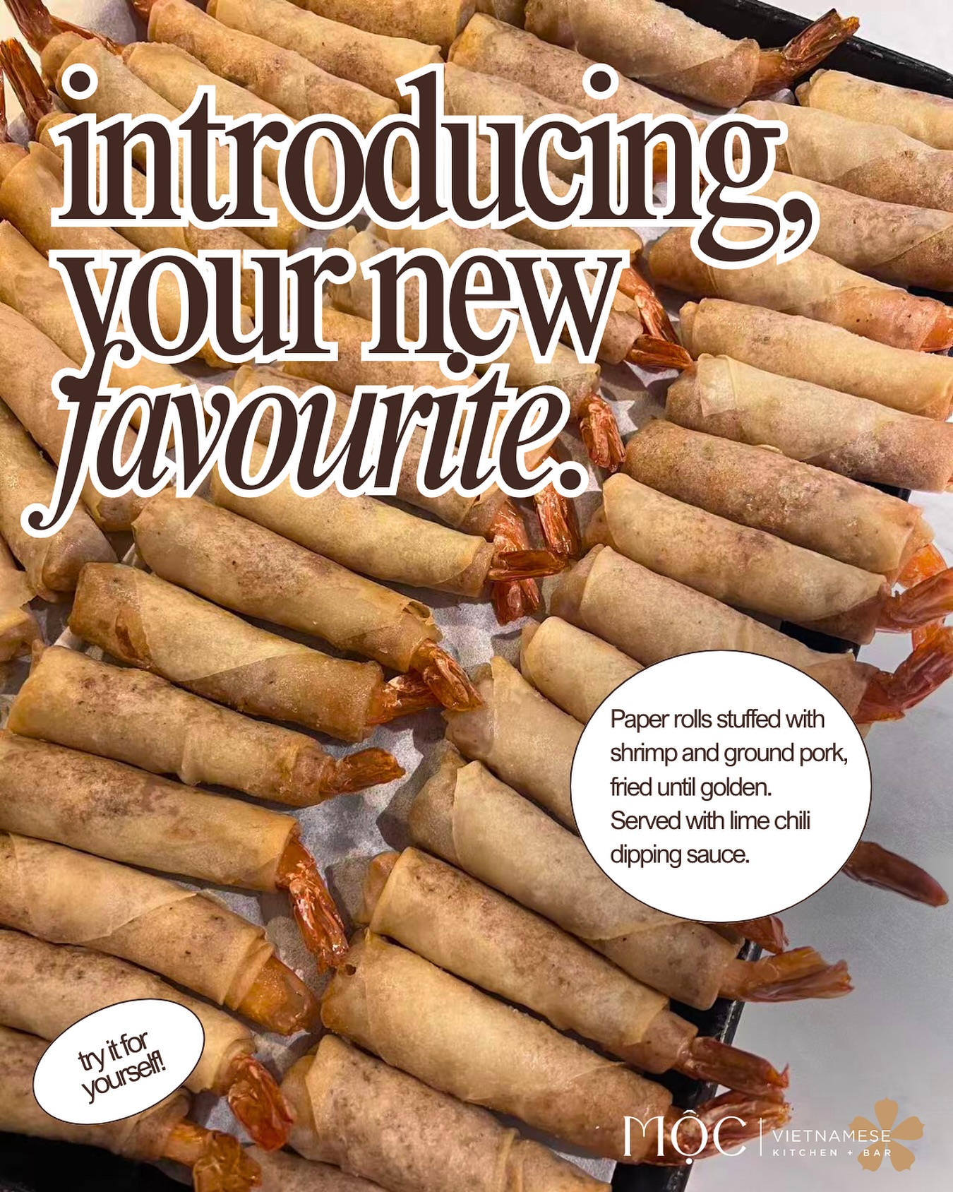Crispy Vietnamese Shrimp Rolls. New menu item: Paper rolls stuffed with shrimp and ground pork, fried until golden. Served with lime chili dipping sauce. House-made fresh daily, crispy and delicious! |