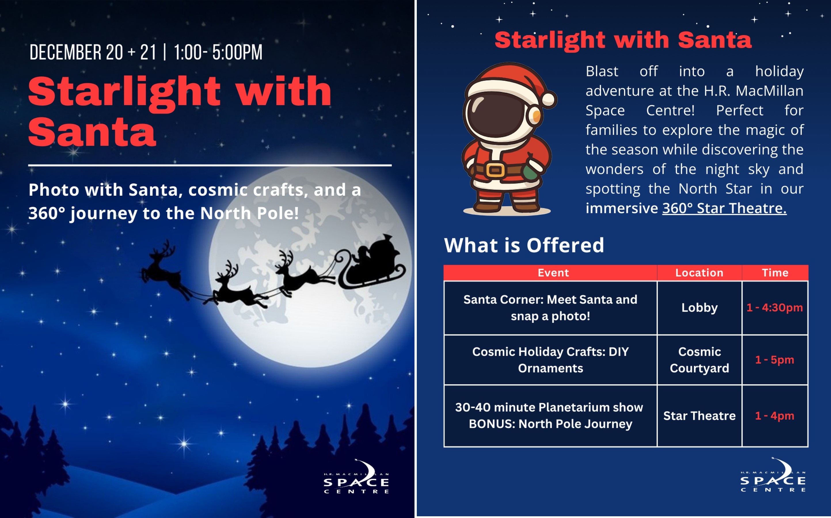 Santa’s Visiting the H.R. MacMillan Space Centre! December 20th and 21st. Join us for a festive family adventure! Snap a photo with Santa, create cosmic holiday crafts, and stargaze the North Pole night sky in our immersive 360° planetarium. ⭐ Can you spot the North Star?