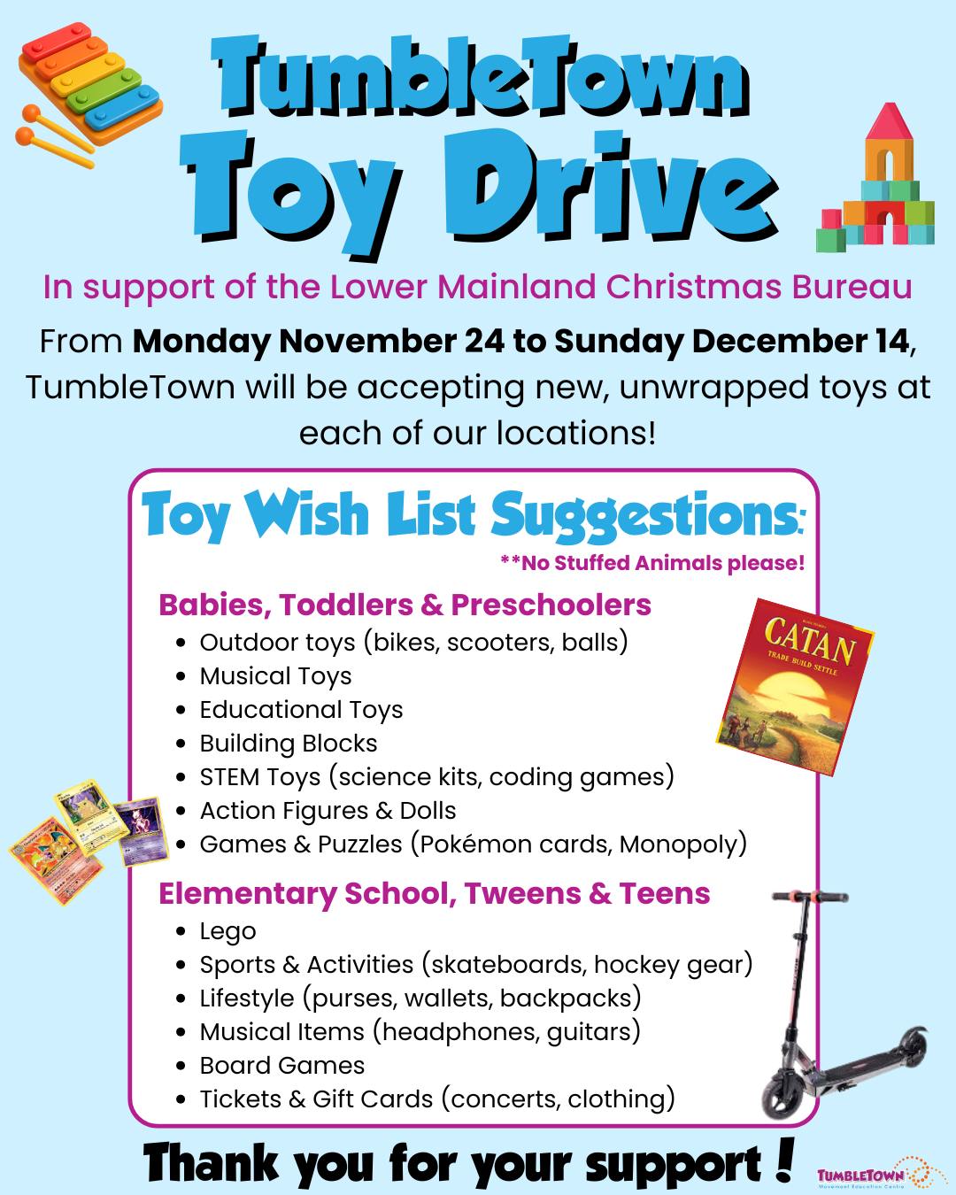 From Nov 24th to Dec 14th, we invite you to share a little holiday joy by bringing a new, unwrapped toy to any TumbleTown locations. Your generosity will help brighten the season for local children through the Lower Mainland Christmas Bureau. Thank you!